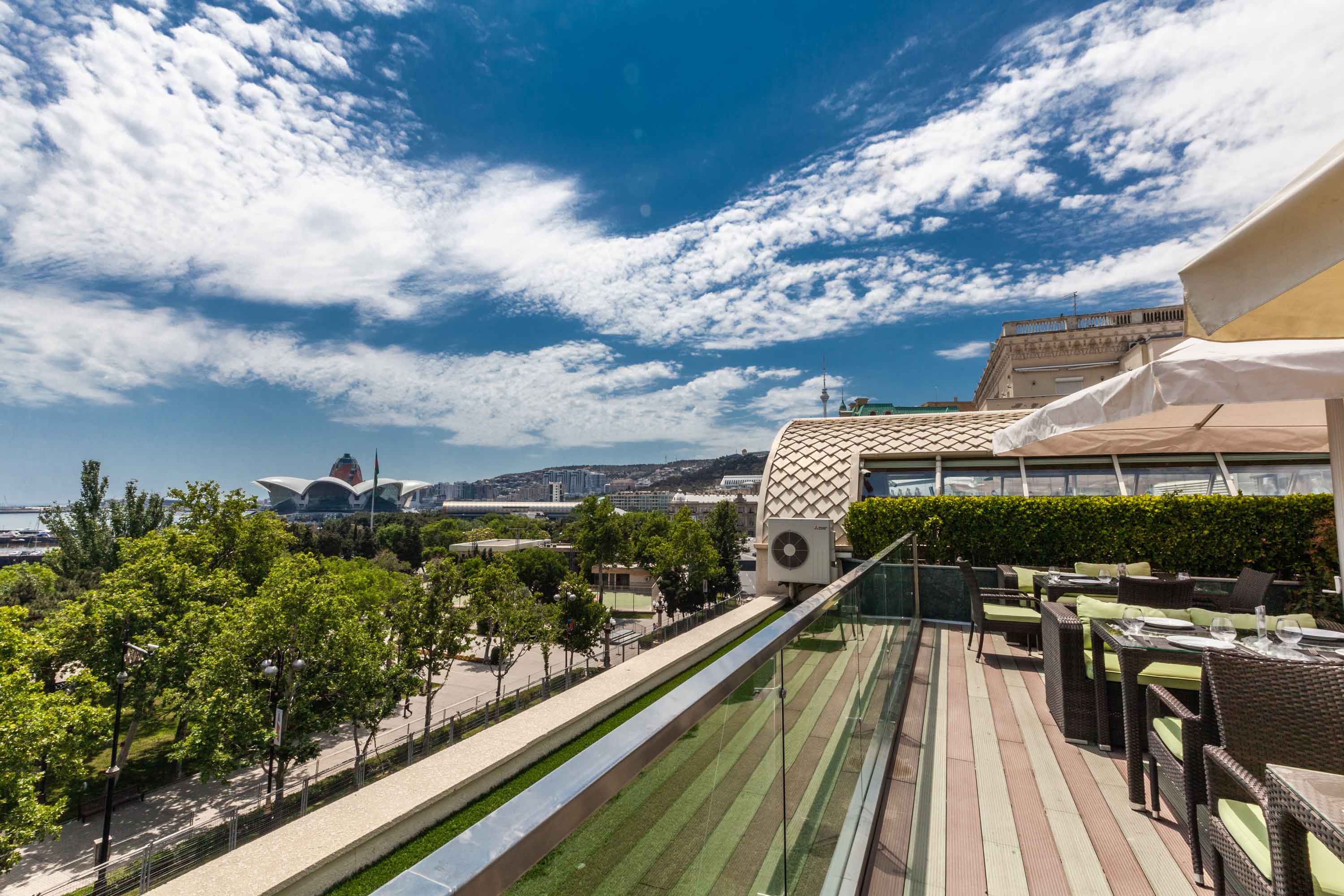 RoofTop Lounge-da 360 dərəcəli görüntü Bakı şəhərinin mərkəzinin və Xəzər dənizinin mənzərəsini özündə cəmləşdirir. Unikal kokteyllər və bol içki menyusu ilə RoofTop həm gündüz, həm də axşam xidmət göstərir.